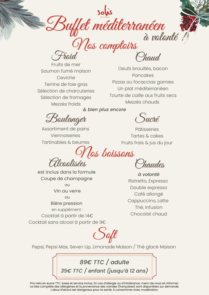Pour prolonger la magie de Noël, Solis vous propose un brunch le jeudi 25 décembre à 89 € par personne et 35€ pour les enfants. C’est l’occasion idéale pour savourer des mets festifs dans une atmosphère détendue et chaleureuse, en famille ou entre amis.