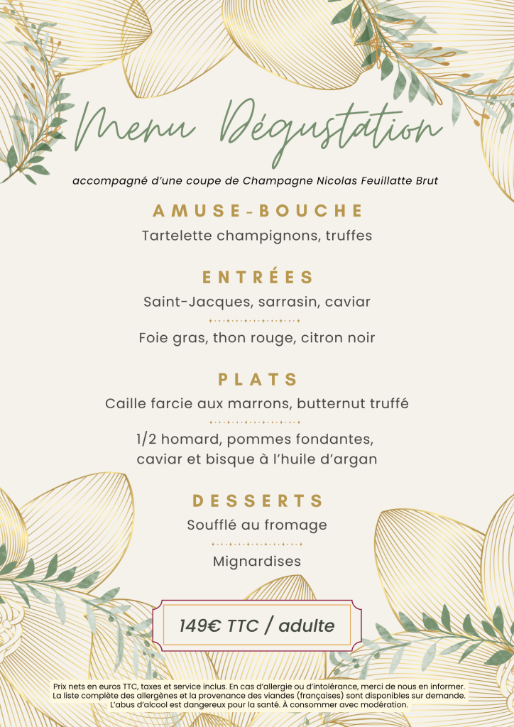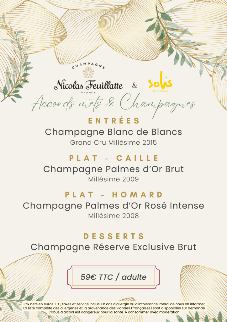 3. Accords champagne raffinés : chaque plat est sublimé par une sélection de Nicolas Feuillatte, pour une expérience gustative complète.
