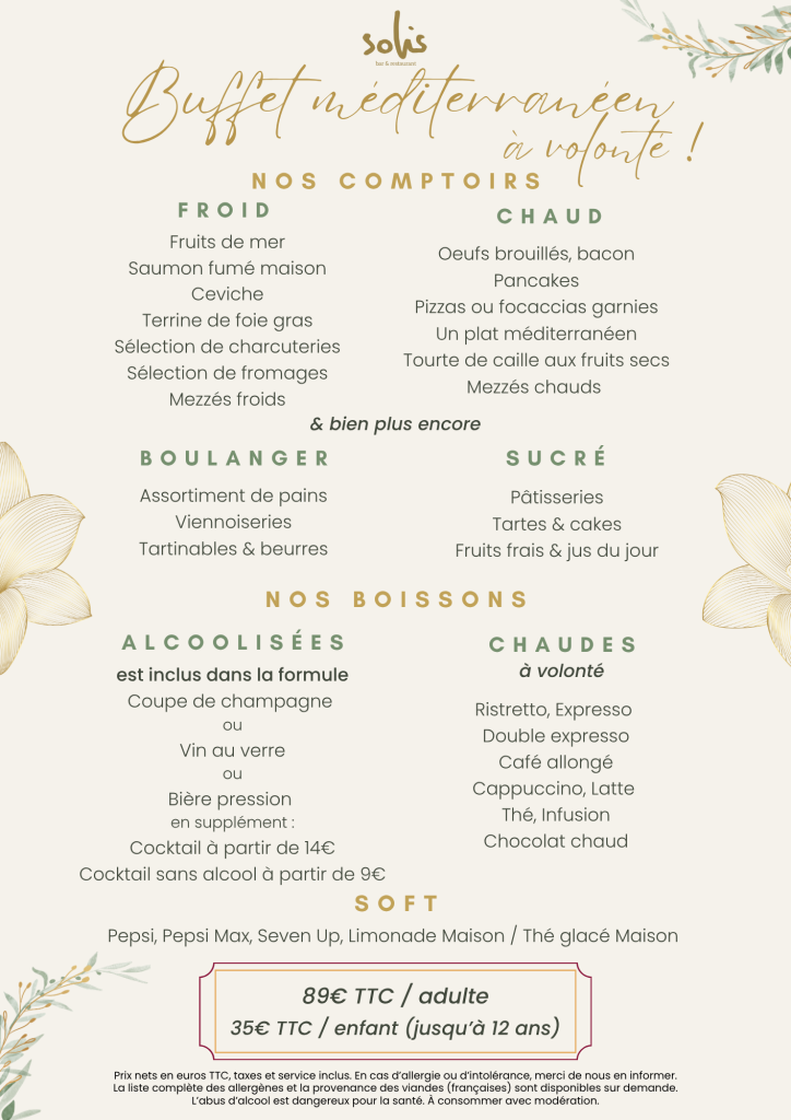 Pour prolonger la fête, le Solis propose un brunch méditerranéen le 1er janvier, au tarif de 89€ / personne. Le brunch est un moment convivial pour démarrer l’année en douceur, dans la même ambiance chaleureuse et festive que le réveillon.